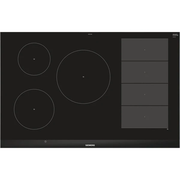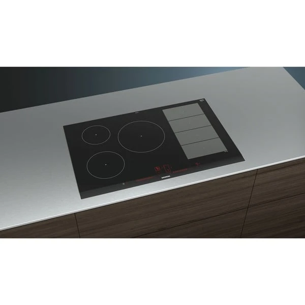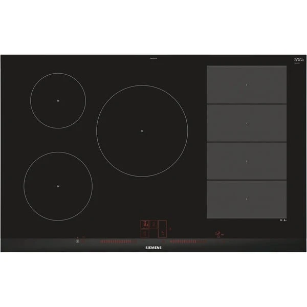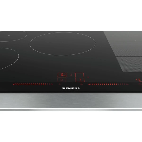 Das Induktions-Kochfeld Siemens EX875LVC1E iQ700 überzeugt mit innovativen Features und einer Glaskeramik-Oberfläche. Das Kochfeld bietet neben den drei klassisch angeordneten Kochzonen eine rechteckige Flächen-Induktions-Kochzone, die zu einer großen zusammengeschaltet werden kann. In diesem Bereich lässt sich das Kochgeschirr beliebig platzieren. varioInduktion Plus passt die Kochzonen an Kochgeschirr bis zu 30cm Durchmesser automatisch an, für mehr Flexibilität. Das EX875LVC1E bietet auch Platz für große Bräter, der Bräter wird sogar erkannt und die Bräterzone automatisch zugeschaltet. Der bratSensor Plus hält die gewünschte Temperatur der Pfanne nach dem Erhitzen automatisch konstant, damit nichts anbrennt. powerMove Plus bietet intuitive Kontrolle dank drei Wärmezonen mit verschiedenen Temperaturen, die sich bei Kontakt aktivieren. In puncto Sicherheit gibt beim EX875LVC1E eine 2-stufige Restwärmeanzeige Meldung darüber, ob und welche der Kochzonen noch Hitze abgibt, außerdem bietet das Kochfeld eine Kindersicherung und einen Timer mit Ausschaltfunktion.Art.-Nr.: 1447853