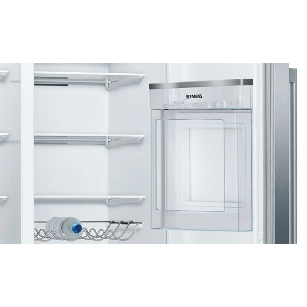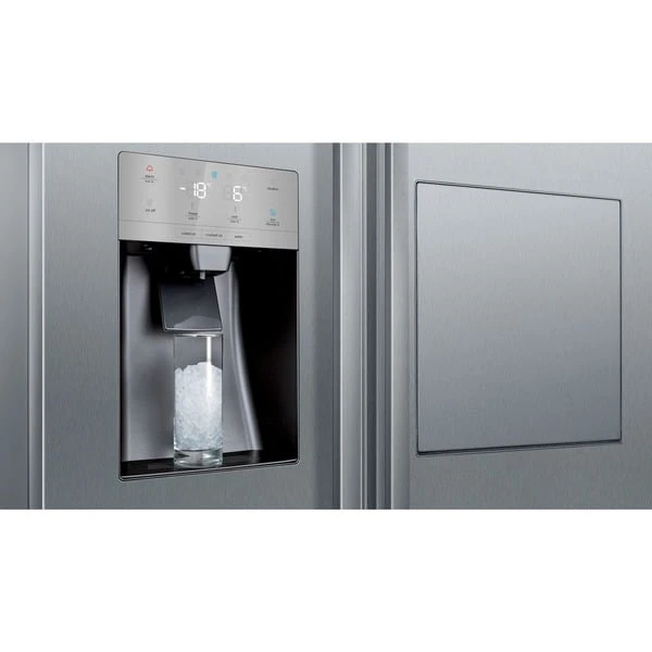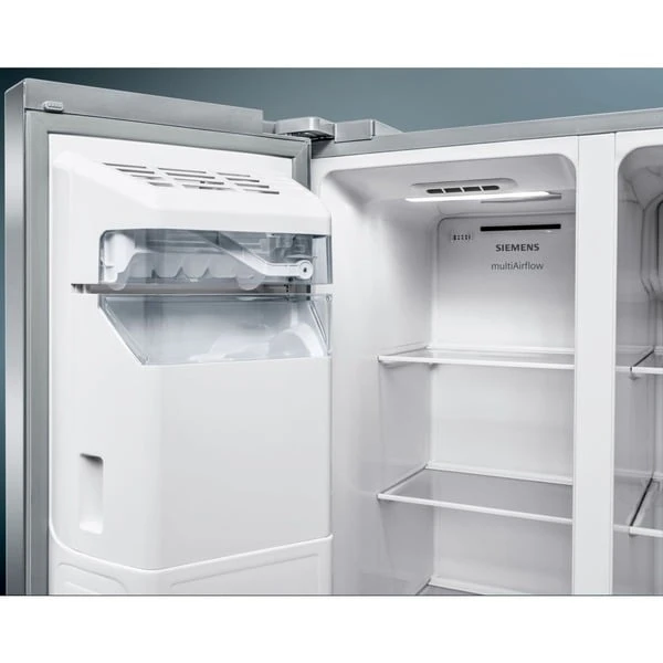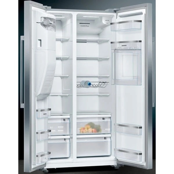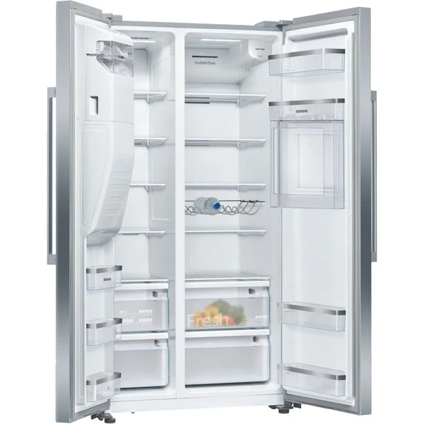 Der Siemens Side-by-Side KA93GAIEP ist mit einem Gesamtnutzinhalt von 560 Litern ideal fĂŒr den gröĂeren Haushalt geeignet. Das 369 Liter umfassende KĂŒhlteil mit MultiAirflow-System bietet auf fĂŒnf AbstellflĂ€chen aus Sicherheitsglas, in zwei FreshBoxen auf Rollen sowie in drei TĂŒrfĂ€chern viel Platz um Lebensmittel ĂŒbersichtlich zu lagern. Das Gefrierteil des KA93IVIFP umfasst 191 Liter und stellt fĂŒnf GlasabstellflĂ€chen, zwei transparente Gefrierschubladen sowie fĂŒnf TĂŒrfĂ€cher fĂŒr TiefkĂŒhlkost zur bereit. NoFrost verhindert zuverlĂ€ssig die Bildung von Eis an den GerĂ€teinnenseiten oder von Reif auf den Lebensmitteln. DarĂŒber hinaus ĂŒberzeugt der KA93GAIEP mit den Funktionen SuperKĂŒhlen und SuperGefrieren sowie einem automatischen EiswĂŒrfelbereiter.Art.-Nr.: 1667546