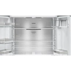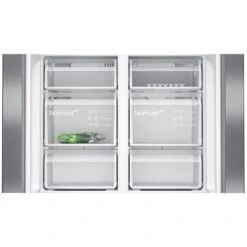 Der French-Door-Kühlschrank Siemens KF96NAXEA ist mit einem Gesamtnutzinhalt von 605 Litern bestens für den großen Haushalt geeignet. Das 405 Liter umfassende Kühlteil stellt vier Abstellflächen aus Sicherheitsglas, eine hyperFresh XXL Box auf Rollen mit Feuchtigkeitsregulierung für Obst und Gemüse, eine hyperFresh 0°C Box für Fisch und Fleisch sowie vier Türfächer zur Verfügung. Dank der Silbermetallic Rückwand mit MultiAirflow zirkuliert kühle, frische Luft für gleichmäßige Temperatur im ganzen Kühlschrank. Der Gefrierbereich mit einem Nutzinhalt von 200 Litern ist mit NoFrost-Technologie gegen Eis- und Reifbildung ausgerüstet und bietet sechs Gefrierschubladen für Tiefkühlkost. Besonders komfortabel sind die SuperKühlen- und SuperGefrieren-Funktion sowie die außenliegende Temperatur- und Funktionssteuerung mittels TouchControl. Zudem lässt sich der KF96NAXEA über die Home Connect App (Android und iOS) auch aus der Ferne Steuern und Überwachen. Mit einem Stromverbrauch von 333 kWh im Jahr ist der KF96NAXEA in die Energieeffizienzklasse E eingestuft.Art.-Nr.: 1774349