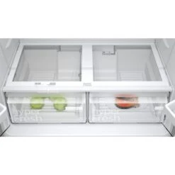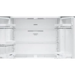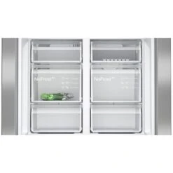 Der French-Door-Kühlschrank Siemens KF96NVPEA ist mit einem Gesamtnutzinhalt von 605 Litern bestens für den großen Haushalt geeignet und bietet jede Menge Komfort. Das 405 Liter umfassende Kühlteil mit Multi-Airflow-System stellt drei Abstellflächen aus Sicherheitsglas, eine hyperFresh Box mit Feuchteregelung auf Rollen für Obst und Gemüse, eine hyperFresh 0°C Box für Fisch und Fleisch sowie sechs Türfächer zur Verfügung. Das Gefrierteil hat ein Volumen von 200 Litern und ist mit sechs Gefrierschubladen ausgestattet, davon zwei bigBoxen zum Stapeln von Einfrierbehältern oder für großes Gefriergut. Dank der noFrost-Technologie gegen Eis- und Reifbildung muss der gefrierraum nie wieder mühsam abgetaut werden. Die Temperaturregelung und Funktionssteuerung des KF96NVPEA erfolgt elektronisch und ist digital ablesbar. Die superCooling-Taste senkt die Temperatur für eine eingestellte Zeit, um frische Lebensmittel schnell zu kühlen, die superFreezing-Taste ist ideal zum schnellen Einfrieren großer Mengen an Lebensmitteln und die Urlaubsschaltung sorgt für energiesparende Kühlung, wenn man nicht zu Hause ist. freshSense ermöglicht eine konstante Temperatur durch intelligente Sensortechnik und das multiAlarm-System mit Memory-Funktion benachrichtigt optisch und akustisch, sobald die Temperatur steigt. Mit einem Stromverbrauch von 333 kWh im Jahr ist der KF96NVPEA in die Energieeffizienzklasse E eingestuft.Art.-Nr.: 1774350