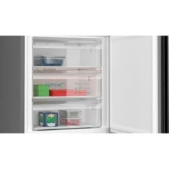 Die Kühl-/Gefrierkombination Siemens KG49NXXCF ist mit einem Gesamtnutzinhalt von 440 Litern ideal für den großen Haushalt geeignet. Im 311 Liter umfassende Kühlbereich haben frische Lebensmittel auf fünf Abstellflächen aus Sicherheitsglas, davon drei höhenverstellbar, in einer hyperFresh Obst-/Gemüseschublade mit Feuchteregelung und einer hyperFresh 0°C Box für Fisch und Fleisch sowie in vier Türfächern jede Menge Platz, um übersichtlich gelagert zu werden. Mit der Taste superCooling werden die Temperaturen im Kühlraum schnell auf +2 °C gesenkt, was beim Einlagern von wärmeren Lebensmitteln in den Kühlraum einen unerwünschten Temperaturanstieg bereits gut gekühlter Speisen verhindert. Der Gefrierbereich der KG49NXXCF umfasst 129 Liter und ist mit drei transparenten Gefriergutschubladen ausgestattet. NoFrost verhindert die Eisbildung, sodass man den Gefrierraum nie wieder mühsam abtauen muss. Die Temperaturregelung und Funktionssteuerung der KG49NXXCF erfolgt getrennt für Kühl- und Gefrierbereich und ist von außen digital exakt ablesbar. Mit einem Stromverbrauch von 178 kWh im Jahr ist die KG49NXIBF in die Energieeffizienzklasse C eingestuft.Art.-Nr.: 1899901