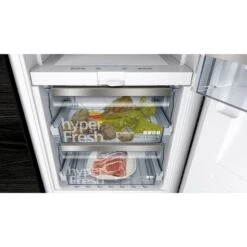 Der vollintegrierbare Kühlschrank Siemens KI41FADE0 stellt einen Gesamtnutzinhalt von 187 Litern zur übersichtlichen Lagerung frischer Lebensmittel zur Verfügung. Er ist mit vier Abstellflächen aus Sicherheitsglas, davon drei höhenverstellbar und eine ausziehbar, sowie drei Türfächern, davon ein Butter-/Käsefach, ausgestattet. Zwei hyperFresh premium 0°C Boxen – eine für Obst und Gemüse und eine für Fisch und Fleisch – kombinieren optimale Feuchtigkeitsregulierung und konstante Temperatur, um Lebensmittel bis zu dreimal länger frisch und knackig zu halten. Die intelligente Sensortechnik FreshSense sorgt im gesamten Kühlraum für eine konstante Temperatur und dank der softClosing-Tür ist der KI41FADE0 stets ordnungsgemäß und vollständig geschlossen. Mit der SuperKühlen-Funktion wird die Temperatur für eine eingestellte Zeit gesenkt, sodass beim Einlagern wärmerer Lebensmittel ein unerwünschter Temperaturanstieg bereits gekühlter Speisen verhindert wird. Mit einem Stromverbrauch von 138 kWh im Jahr ist der KI41FADE0 in die Energieeffizienzklasse E eingestuft.Art.-Nr.: 1665783
