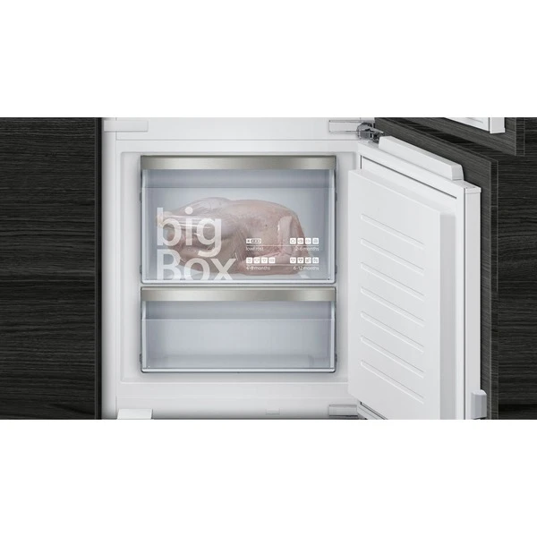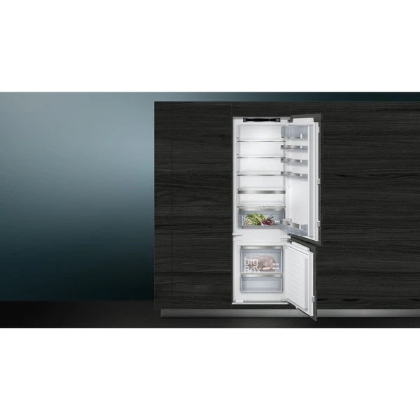 Die vollintegrierbare Kühl-/Gefrierkombination Siemens KI87SADE0 stellt einen Gesamtnutzinhalt von 272 Litern zur übersichtlichen Lagerung frischer Lebensmittel zur Verfügung und bietet viel Komfort. Der 209 Liter fassende Kühlraum ist mit fünf Abstellflächen aus Sicherheitsglas, davon vier höhenverstell- und eine ausziehbar, sowie fünf Türfächern, davon ein Butter-/Käsefach, ausgestattet. Die hyperFresh plus Box mit Feuchteregelung hält Obst und Gemüse bis zu zweimal länger frisch. Mit der SuperKühlen-Funktion wird die Temperatur im Kühlraum für eine eingestellte Zeit gesenkt, sodass beim Einlagern wärmerer Lebensmittel ein unerwünschter Temperaturanstieg bereits gekühlter Speisen verhindert wird. Der flexibel nutzbare Gefrierbereich der KI87SADE0 umfasst 63 Liter und stellt zwei transparente Gefriergutschubladen zur Verfügung, davon eine bigBox um großes Gefriergut optimal zu lagern und zu stapeln. Die geringere Eisbildung durch die LowFrost-Technologie spart Energie und Arbeit beim Abtauen und die intelligente Sensortechnik FreshSense sorgt im gesamten Kühlschrank für eine konstante Temperatur. Dank softClosing schließt die Tür automatisch und sanft, wenn der Öffnungswinkel maximal 20° beträgt. Mit einem Stromverbrauch von 207 kWh im Jahr ist die KI87SADE0 in die Energieeffizienzklasse E eingestuft.Art.-Nr.: 1665723