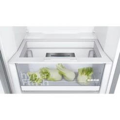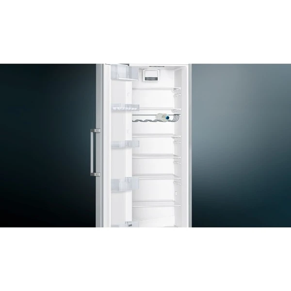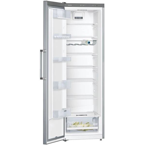 Der Kühlschrank Siemens KS36VVIEP stellt einen großzügigen Gesamtnutzinhalt von 346 Litern zur übersichtlichen Lagerung frischer Lebensmittel zur Verfügung. Ausgestattet ist er mit sieben Abstellflächen aus Sicherheitsglas, davon fünf höhenverstell- und sechs ausziehbar, sowie einem verchromten Flaschenrost und fünf Türfächern, davon ein Butter-/Käsefach. In der hyperFresh Box mit Feuchteregelung bleibt Obst und Gemüse länger frisch und knackig. Die intelligente Sensortechnik FreshSense sorgt im gesamten Kühlraum für eine konstante Temperatur und mit der SuperKühlen-Funktion wird die Temperatur für eine eingestellte Zeit gesenkt, sodass beim Einlagern wärmerer Lebensmittel ein unerwünschter Temperaturanstieg bereits gekühlter Speisen verhindert wird. Mit einem Stromverbrauch von 116 kWh im Jahr ist der KS36VVIEP in die Energieeffizienzklasse E eingestuft.Art.-Nr.: 1665888
