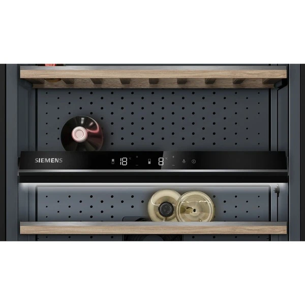 Der Weinkühlschrank Siemens KW36KATGA verfügt über zwei separate Temperaturzonen, die je nach Bedarf flexibel auf die ideale Trinktemperatur zwischen +7 °C und +19 °C eingestellt werden können – für vollmundige Rotweine und fruchtige Weißweine. Dank der zehn hochwertigen Eichenregale mit Metallapplikationen ist die gesuchte Flasche Wein stets griffbereit. Der KW36KATGA bietet auf 370 Litern Nutzinhalt Platz für bis zu 199 Bordeaux-Weinflaschen á 0,75 Liter, die dank der Glastür mit UV-Schutz und dem LED-Präsentationsmodus perfekt in Szene gesetzt werden können. Die Kindersicherung verhindert ein versehentliches Verstellen der gewählten Temperatur und der Innenventilator sorgt für eine optimale Kälteverteilung. Mit einem Stromverbrauch von 155 kWh im Jahr ist der KW36KATGA in die Energieeffizienzklasse G eingestuft.Art.-Nr.: 1834434